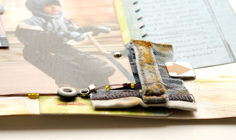 Использовала: куски от старых джинсов, брадс, шнур, пуговицы, бисер, проволоку, бумага ММЕ на подложках под фото и кусочек линованной бумаги для написания заметок, спрей оранжевый, акварельные краски, буквы вырезаны из журнала Seasons.